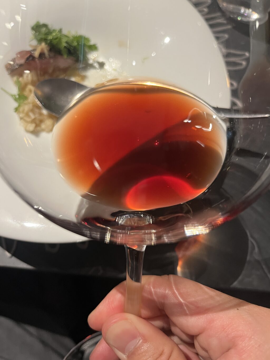 ここまでのワインがすごすぎて、この美味しいワインを普通に感じてしまった。香りのボリュームがこれまでのワインより控えめな感じがしました。開くのを待って空気に触れさせもしましたが、グラスの都合上諦めました。