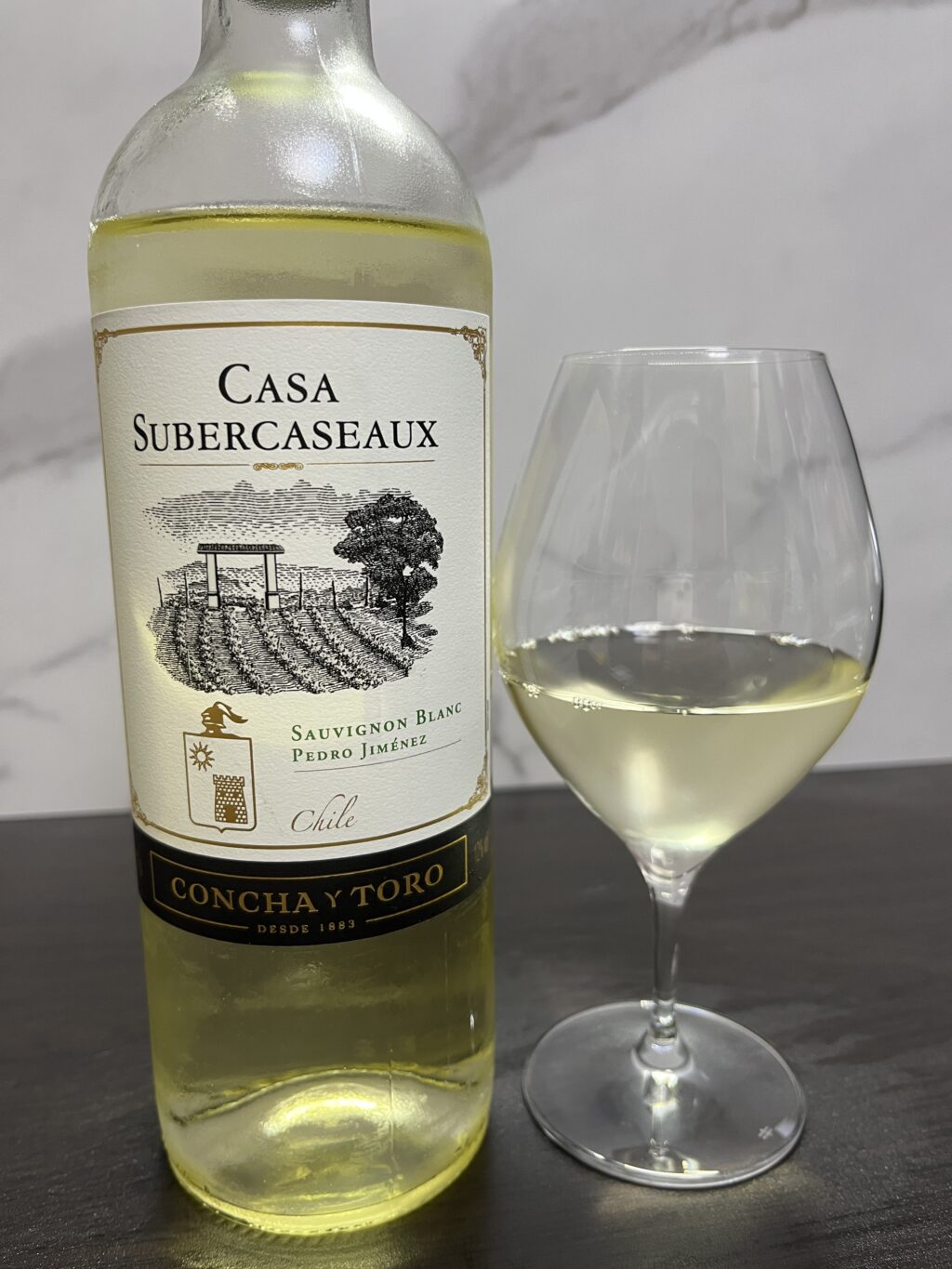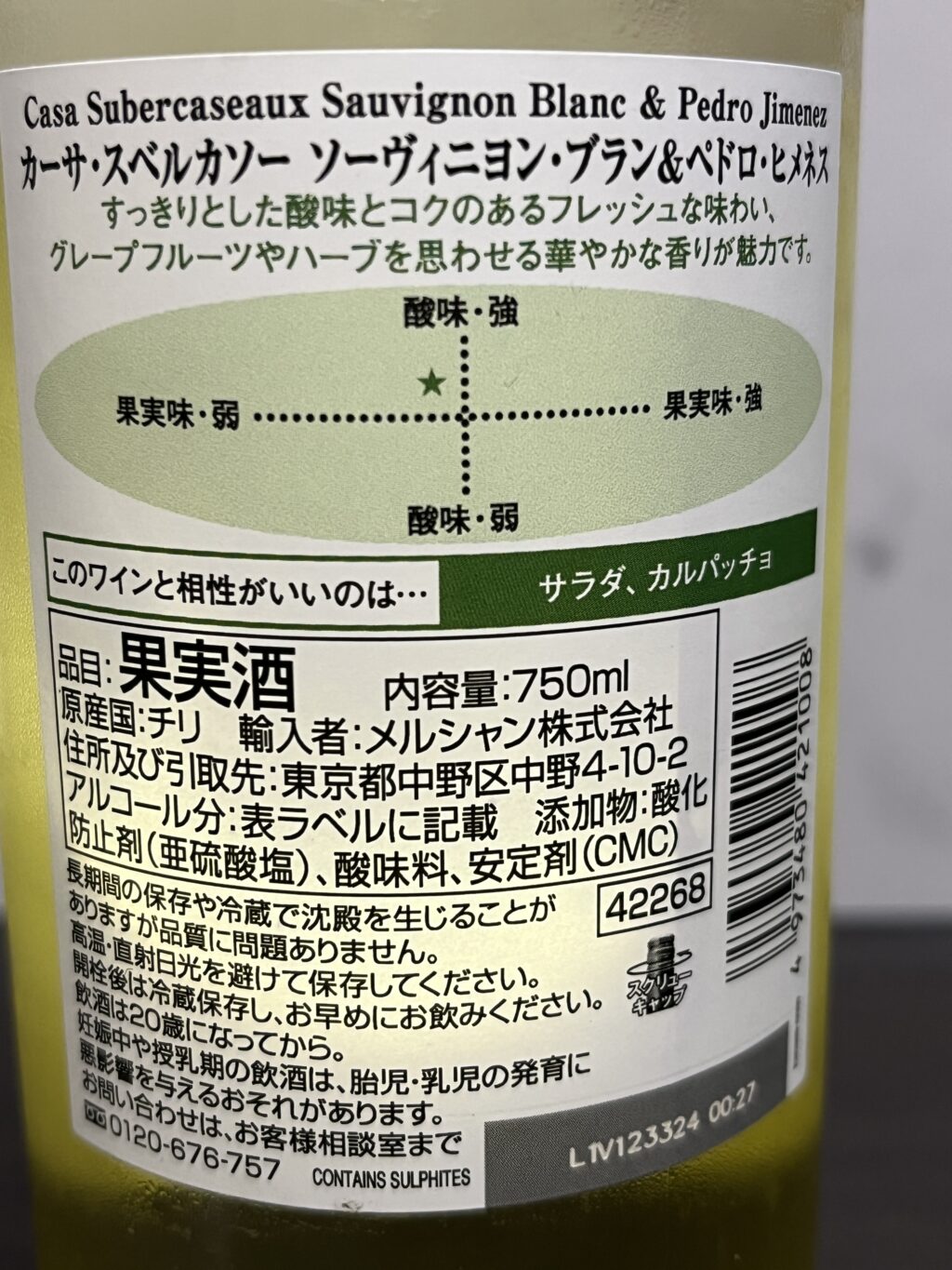 チリ産。ブドウ品種はソーヴィニョン・ブランとペドロヒメネスのブレンド。小売価格は税込640円(2025年5月現在)。ヴィンテージは先日飲んだシャルドネどうように記載なし。